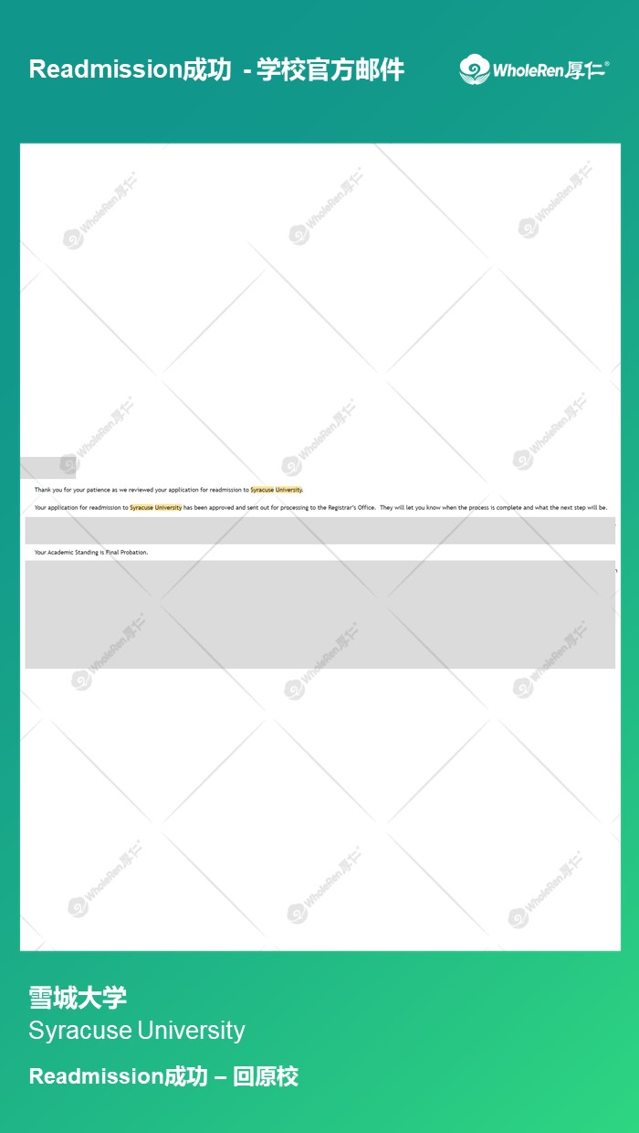 专家老师在了解学生的学习经历后,指导学生紧急转学并迅速回归学术正轨,保持良好的学术状态,最终在专家老师的帮助下顺利Readmission返回原校。