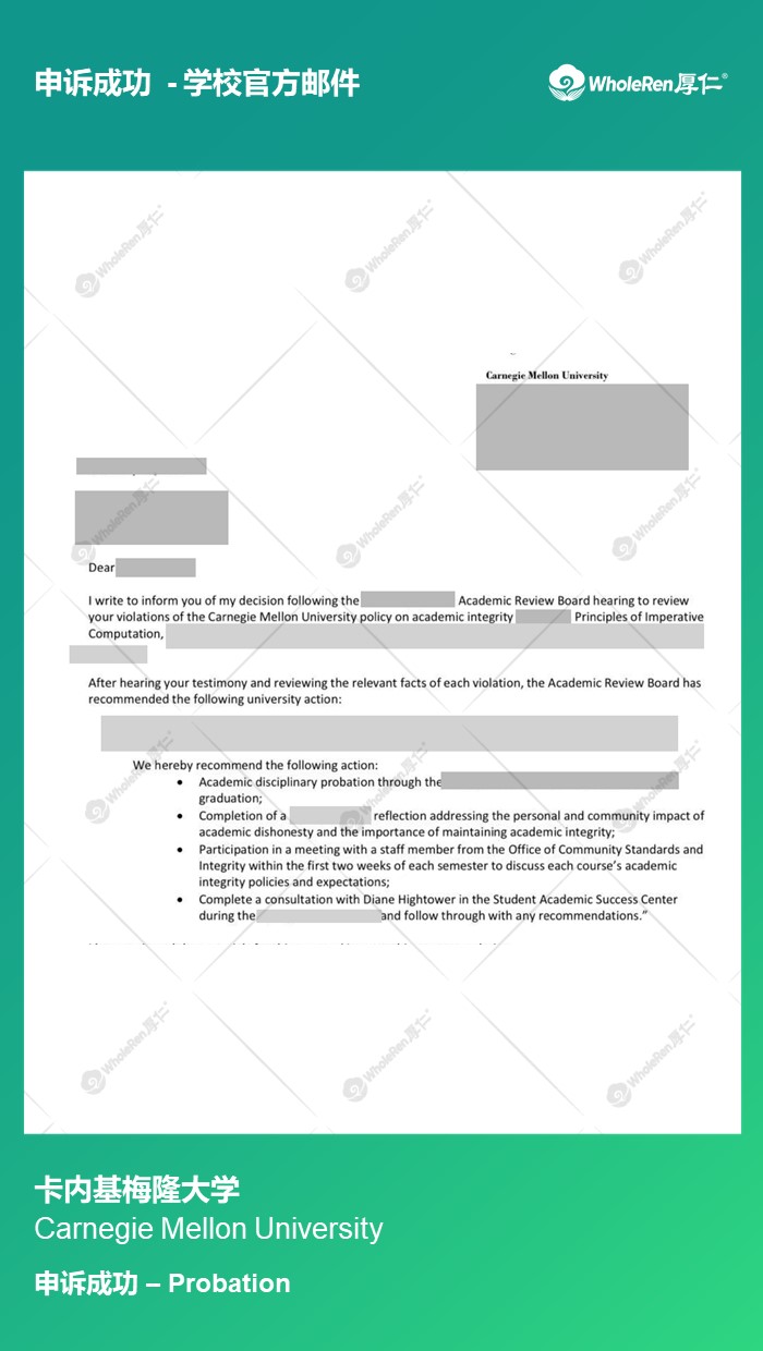 专家老师在了解学生情况后,指导学生解释上传作业的原因,但是没有采用网上的答案。对于自己的错误行为作出诚恳道歉和求情,最终学校只给了Probation的警告,成功避免停学。