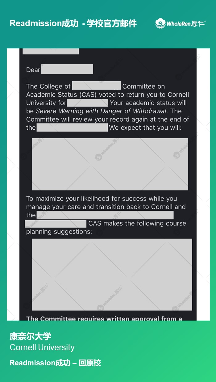 【Cornell】W同学压力大成绩差被开除帮助后回归原校