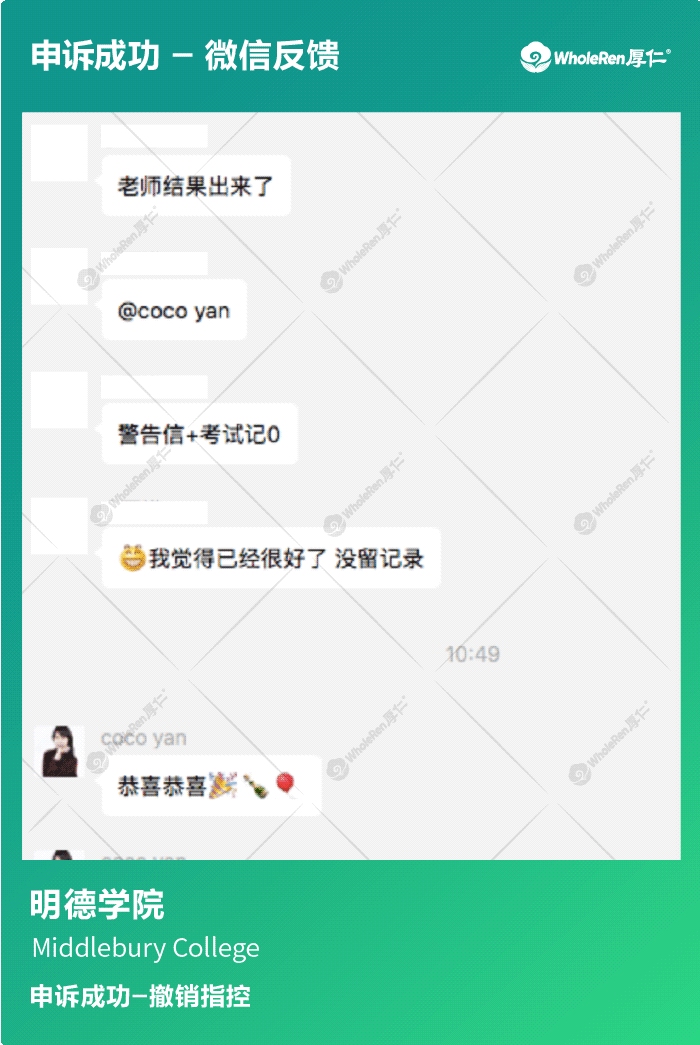 Z同学在一场考试时因为手机一直在响,无奈拿出手机关闭的时候,被监考老师发现并举报作弊。学生面临被停学的处分。厚仁专家老师在了解学生当时情况后,指导学生应对面谈。 通过学生在之前学习表现优良以及如何复习考试,解释没有作弊动机;通过解题思路和步骤证明自己独立完成的考试,通过合理沟通后,学校老师相信了学生,只给出一个警告,无不良学术记录。