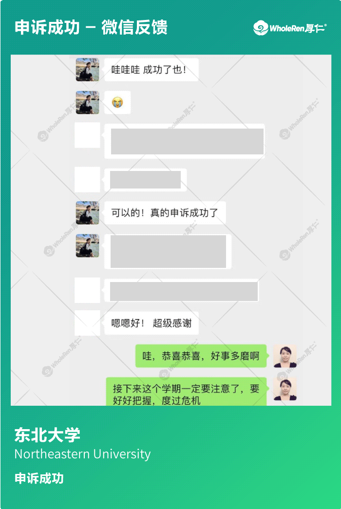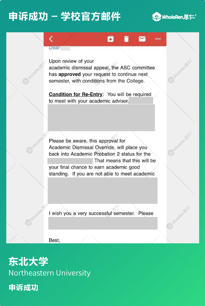 C同学在初来美国时一直保持积极向上的学习态度,GPA也在3.0以上。后来因为家人重病导致分心影响学习,大二时学期GPA低于2.0,C同学收到了留校察看的处分。由于接下去的课程难度加大,加上心系家人,导致接下去的学习依然成绩不理想,C同学面临被开除的境地。 专家老师在了解情况后尽快帮助C同学准备申诉材料,证明C同学的成绩受外界严重影响,并制定切实可行的改善计划,最终学校接受了C同学的申诉,C同学成功留校。