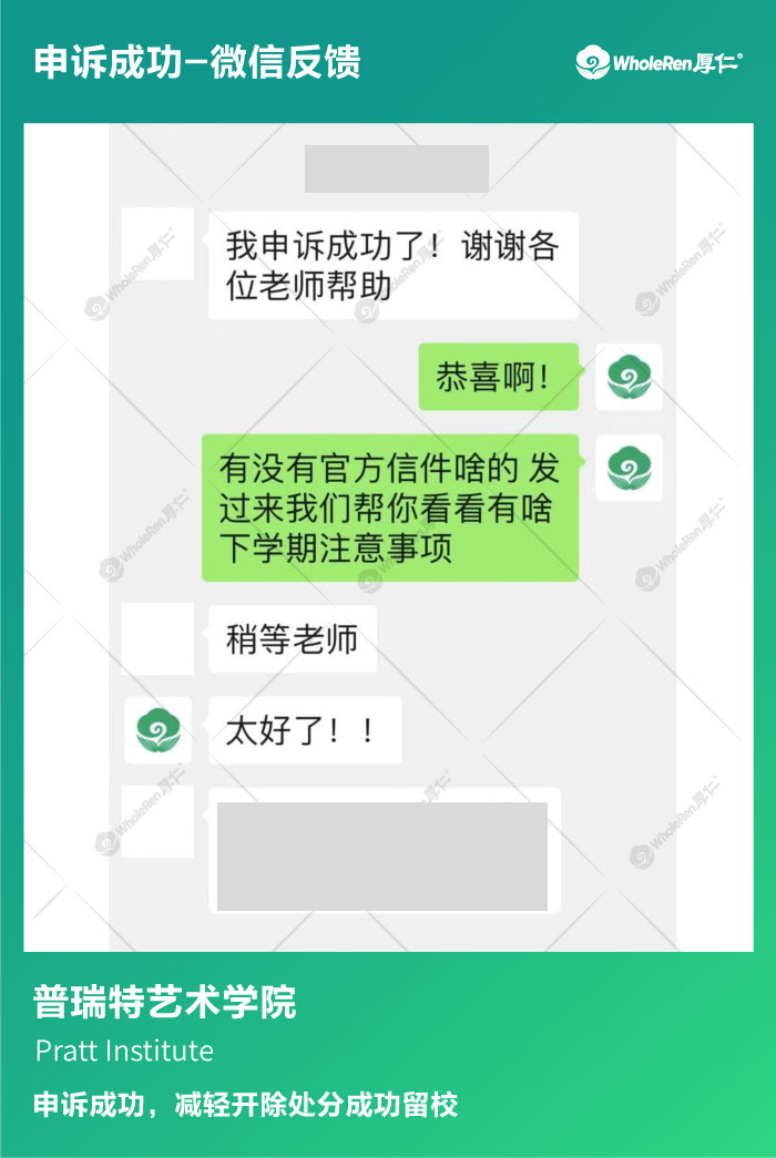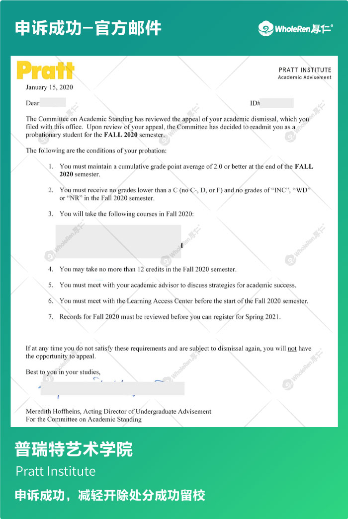 T同学因为刚来美国,对新的学习环境还不适应,也不知如何选择合适的课程,导致第一学期GPA不到1.0直接被学校开除。 专家老师帮助T同学分析了解决成绩问题的关键,指导T同学完善申诉信,强调了学生所作出的努力以及在之后如何改善学习不佳的现象,最终学校愿意再给学生一个机会,将开除降为停学一学期,2020秋季学期重返学校。