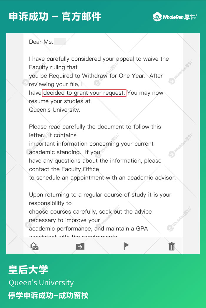 Y同学在刚来加拿大时,因为不会选课,跟不上老师的教课节奏,加上平时没有良好的学习习惯和系统的学习计划,导致第一学年GPA不到1.0,学校要求第二年必须提高GPA。Y同学虽有进步,但GPA依然没有达标,被学校停学一年。 专家老师在了解Y同学的学习经历后,帮助Y同学分析了成绩不理想的根本原因,制定了有效的学习规划,指导Y同学完成了一封优质的申诉信,通过与学校的沟通,学校最后撤销停学处分,Y同学成功留校。