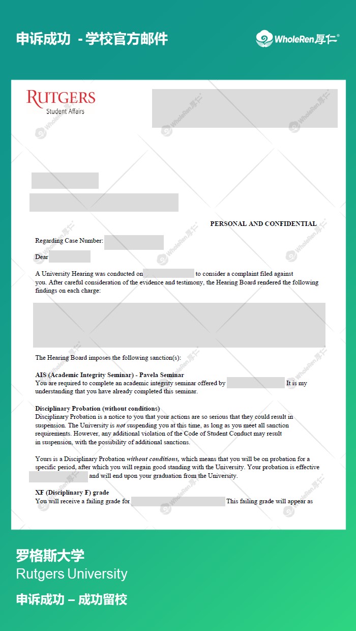 专家老师在了解情况后,指导学生解释自己的处境,并针对自己的错误行为作出诚恳道歉和求情,最终学校只给了留校察看的处分,不影响学生毕业和求职。