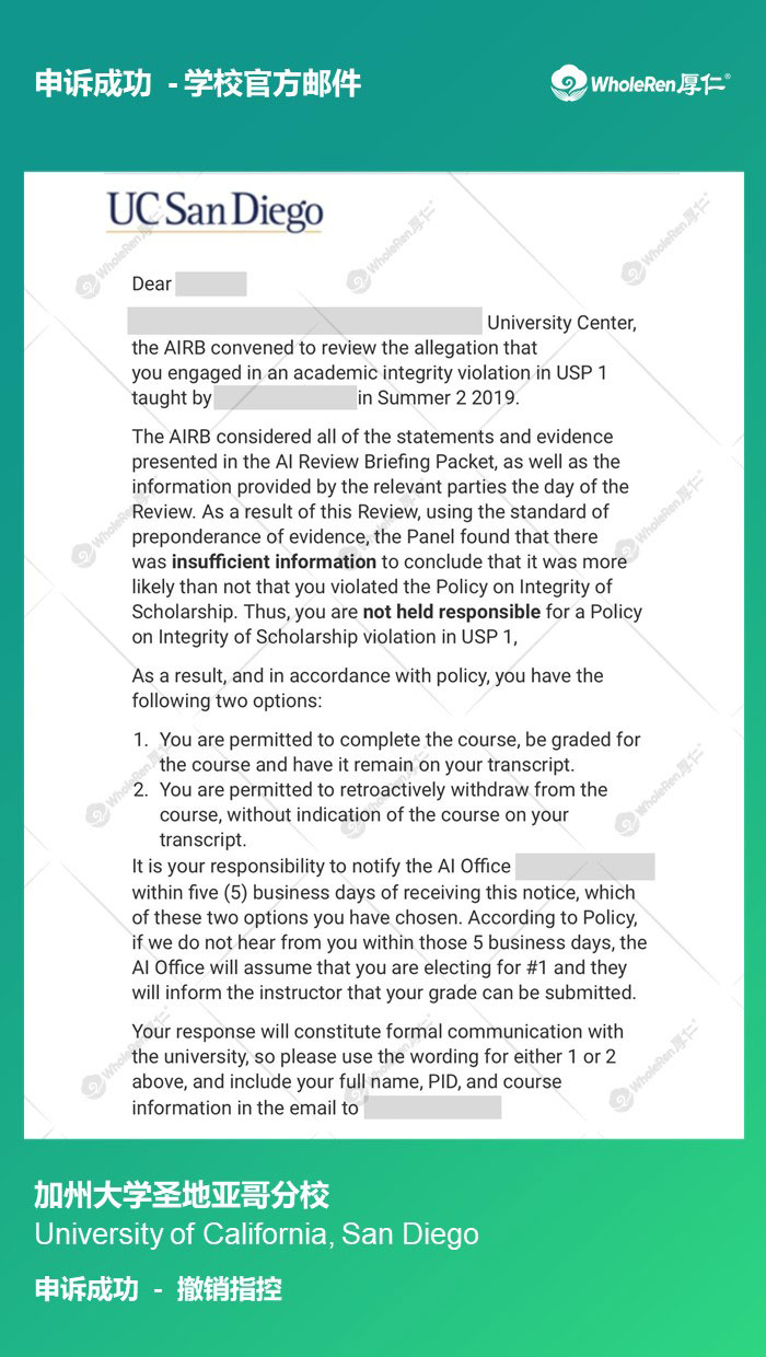 【UCSD加州大学圣地亚哥分校】L同学第三次学术不诚信申诉撤销指控