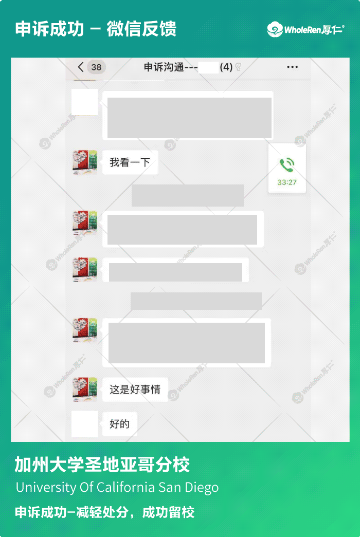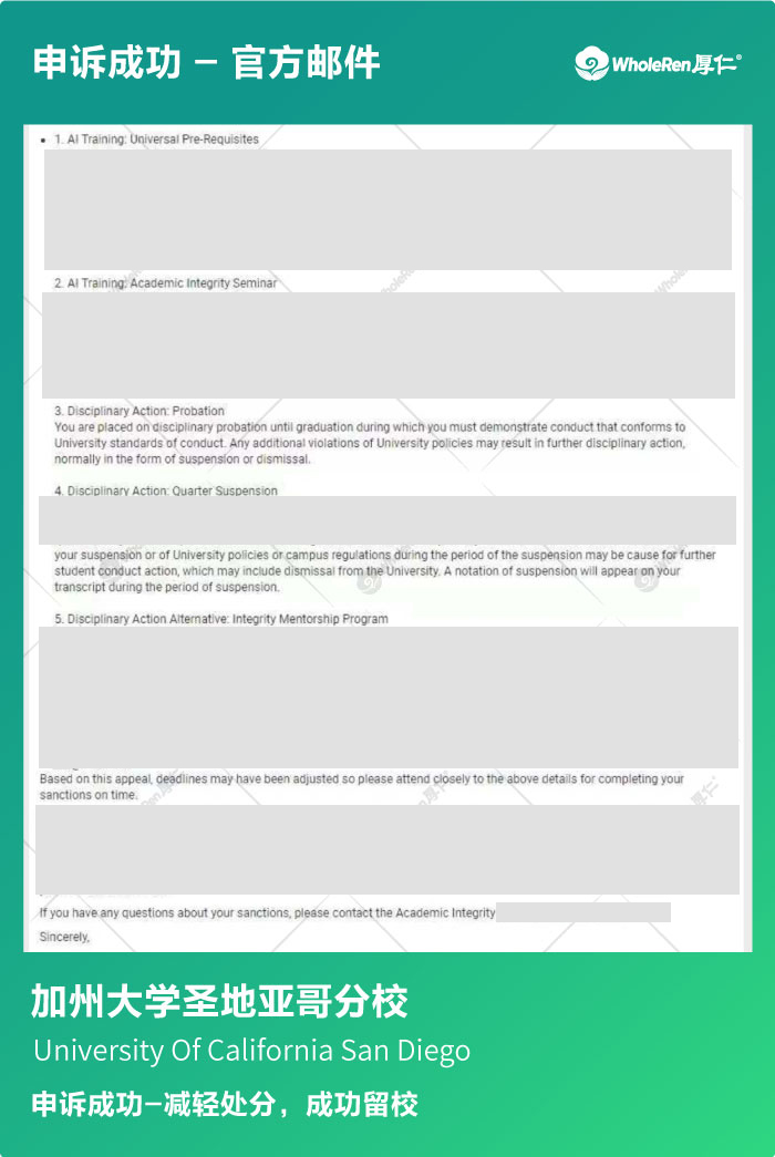 W同学在做作业时,抄袭之前学生的作业被老师发现,在承认错误后,老师给出了停学的处分,学生认为处分太严重,想提出申诉减轻处罚,于是求助厚仁。 专家老师在了解学生情况后,找出学生之前沟通过程中的不足,指导学生针对处分结果进行申诉,最终帮助W同学申诉成功,撤销停学处分,成功留校。