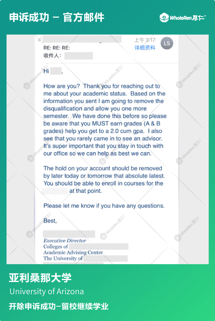Z同学在刚入大学时,因为选课不当导致成绩不达标被留校察看,同时对Z同学也造成了一定心理压力。虽然后期有积极联系advisor沟通选课,由于对未来专业的迷茫加上极度想提高成绩,使自己压力太大,最后成绩虽然有所提高,但是依然没有满足学校要求,面临被开除。 专家老师在了解情况后,先对Z同学进行心理疏导,帮助Z同学找到成绩不理想的问题所在,引导Z同学制定合理的学习计划,重建学习信心。本身学校已经不接受申诉了,但是看在Z同学的诚恳态度和积极改善学习的计划,学校最后决定给Z同学一次机会继续学业,Z同学成功留校继续学业,也更有信心去提高成绩!