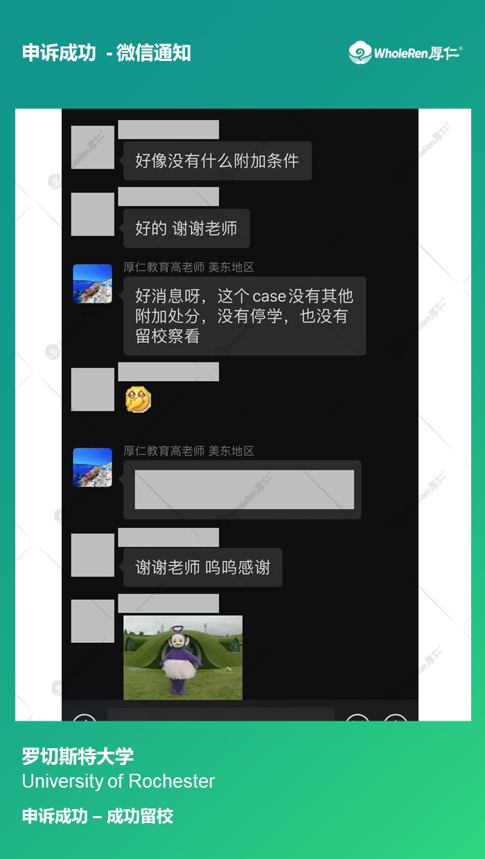 W同学因为家庭原因导致心情抑郁,考试时不小心cheat sheet带去了,被老师举报作弊。由于学生之前有过一次不诚信记录,面临被停学的处分。 专家老师了解学生的情况后,指导学生解释自己的行为,并证明考试时没有使用自带的材料,无作弊动机,最终解释成功留校