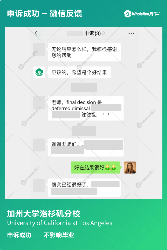 同学在一门课中因为多次作业涉嫌抄袭code被老师举报,学校根据老师的证明给出了开除处分。由于学生已经大四,并且拿到了学校的研究院项目录取,学生希望厚仁的专家老师能够帮助自己继续学业。 专家老师在分析学生作业之后,指导学生针对每一处涉及抄袭的内容给出了解释,并向学校道歉求情,最终学校将开除处分减轻到deferred dismissal,学生五年内没有再次违纪将没有不良学术记录