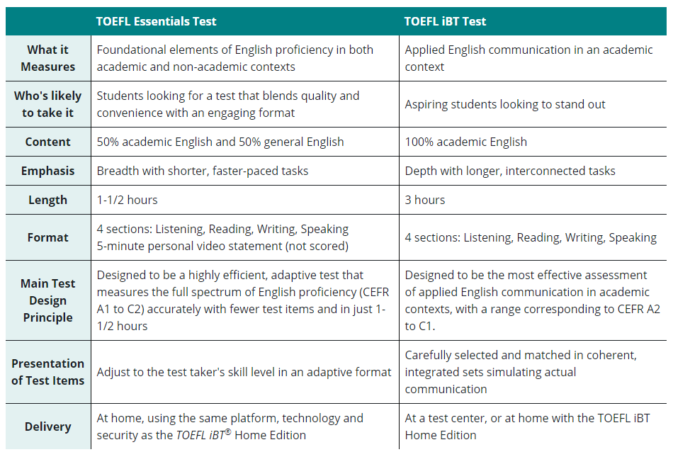TOEFL Essentials考察50%的学术英语和50%的通用英语,TOEFL iBT考察的是100%学术英语;