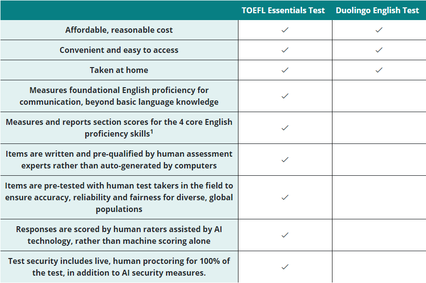 与Duolingo英语测验相比,TOEFL Essentials测验更加便利,而且测验质量更高。