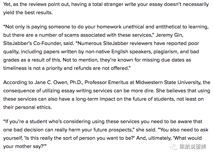 “让别人代写作业,不仅违反道德准则,而且这个领域,有很多欺诈性服务。非常多的用户反馈低下的质量,抄袭,以及因此得到的坏成绩。更不用说了,这些服务经常会错过截止日,因为时间不是代写服务的优先级,而且退款难以拿到”。