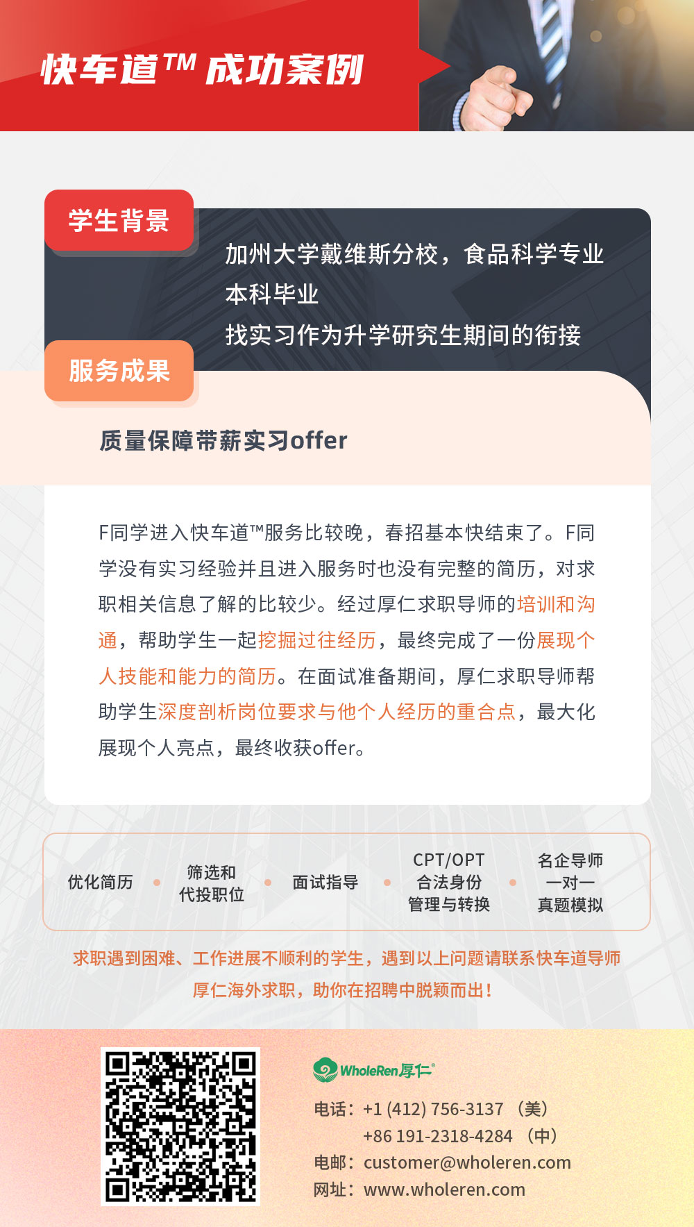F同学进入快车道™服务比较晚,春招基本快结束了。F同学没有实习经验并且进入服务时也没有完整的简历,对求职相关信息了解的比较少。经过厚仁求职导师的培训和沟通,帮助学生一起挖掘过往经历,最终完成了一份展现个人技能和能力的简历。在面试准备期间,厚仁求职导师帮助学生深度剖析岗位要求与他个人经历的重合点,最大化展现个人亮点,最终收获offer。