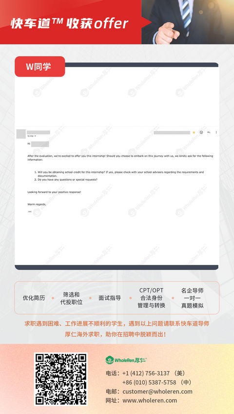 W同学在秋招的时候自己投递了很多岗位,但是迟迟都没有任何回应。在秋招快结束前W同学找到厚仁,选择了快车道™项目!厚仁求职导师在短时间内快速带领学生完成简历打磨,随后立刻开展了精准投递工作,在感恩节前夕收到公司面试邀请!厚仁导师对W同学进行多次面试辅导,经历过三轮面试后,终于收到公司的offer!