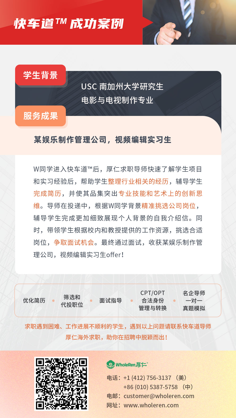W同学进入快车道™️后,厚仁求职导师快速了解学生项目和实习经验后,帮助学生整理行业相关的经历,辅导学生完成简历,并使其品集突出专业技能和艺术上的创新思维。导师在投递中,根据W同学背景精准挑选公司岗位,辅导学生完成更加细致展现个人背景的自我介绍信。同时,带领学生根据校内和教授提供的工作资源,挑选合适岗位,争取面试机会。最终通过面试,收获某娱乐制作管理公司,视频编辑实习生offer!