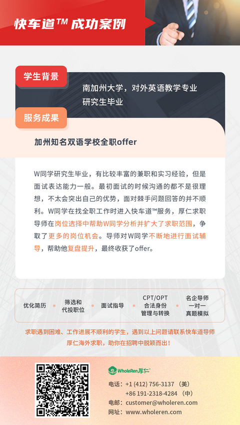 服务成果:加州知名双语学校全职offer,加州某小学老师全职offer,加州某中文学校全职offer,加州某国际学校老师全职offer