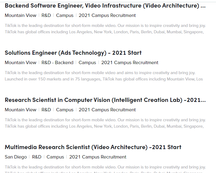 今年大热的TikTok,在11月开启了校招,登录官网即可申请,2月会陆续开始面试合格的候选人。对即将毕业的毕业生开放的岗位包括:广告算法工程师、后端工程师、数据工程师、用户运营专员、前端工程师、软件工程师、机器学习工程师、多媒体研究科学家和网络安全师等,主要是以技术岗为主。