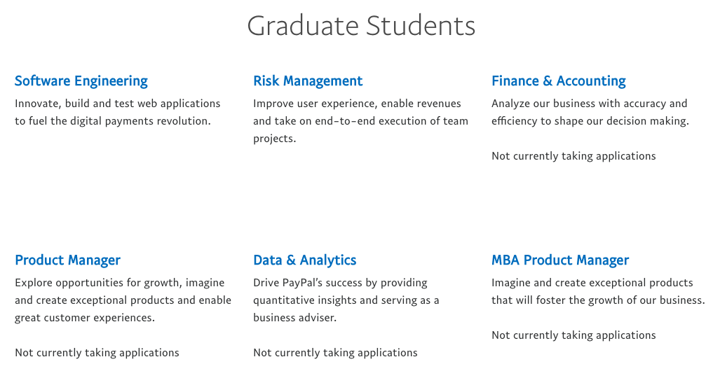 Paypal的春招则来的更实际,直接在官网上发布了只招聘软件工程和风险管理的应届研究生毕业生,当然岗位发布信息都是在上周,所以想抢占先机的赶紧投递简历,抓紧这几天!