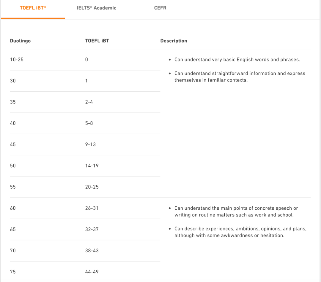 再者,美国大学目前对于国际学生英语水平的认证方式有多种,除了托福考试iBT以外,还有雅思IELTS,以及目前大热的Duolingo,而每一个种考试都有一个分数之间的换算,以duolingo官方为例: