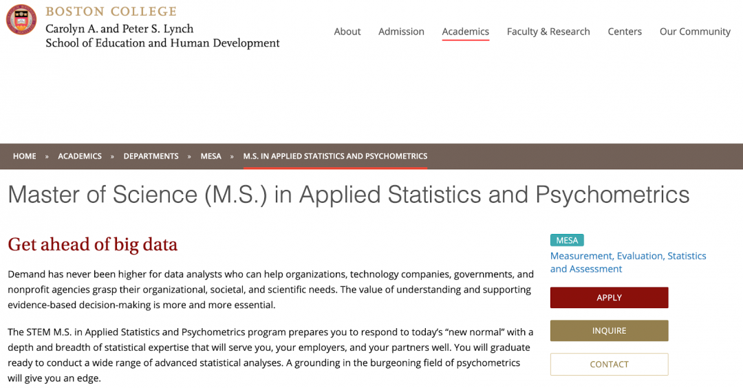 其次,学院的不同,专业的叫法也会不一样。比如UCLA,下设在Psychology部门,所以专业名称为quantitative psychology,所教授课程更多偏重psychology。还有的则在Education教育学院,比如Boston College,它的项目全称为:Master of Science (M.S.) in Applied Statistic and Psychometrics,我们以这个专业为例,来了解一下课程的设置和申请条件。