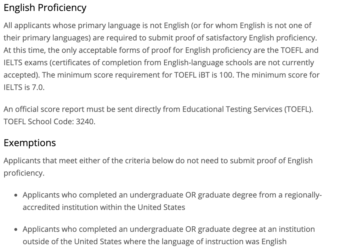 对于国际学生,托福的分数要求是100分。如果没有达到,在满足其他条件的基础上,也可能会被conditional admission录取。需要在项目开学前6周达到学校的托福分数要求即可。对于美本的学生则不需要再提交托福