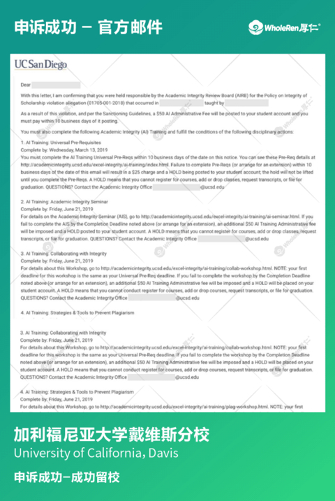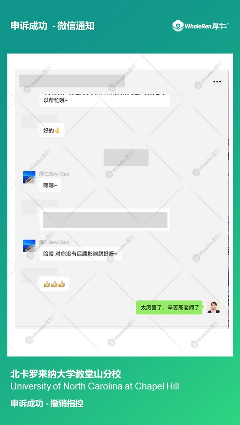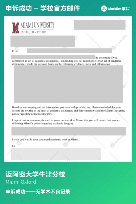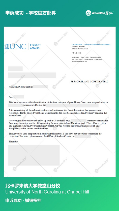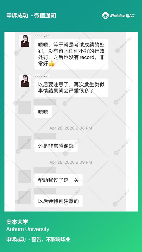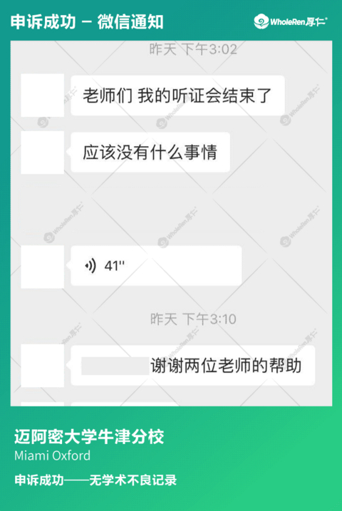 H同学在同一学期两门课都被指控学术不诚信,虽然H同学没有违纪,但是面对两门课的指控并无明显证据证明自己的无辜,恐怕很难不被处分。 在专家老师了解情况后,立即帮助H同学分别制定应对方案,指导H同学听证会的说辞以及帮助H同学进行模拟听证会。针对每个指控都做出详细解释并阐明自己没有作弊动机。在H同学诚恳的解释下,学校相信了H同学没有违纪,撤销指控