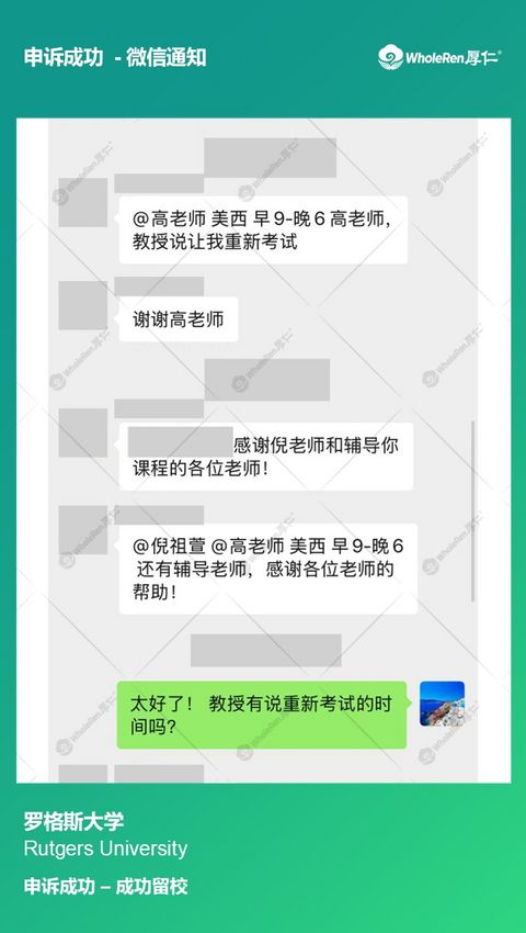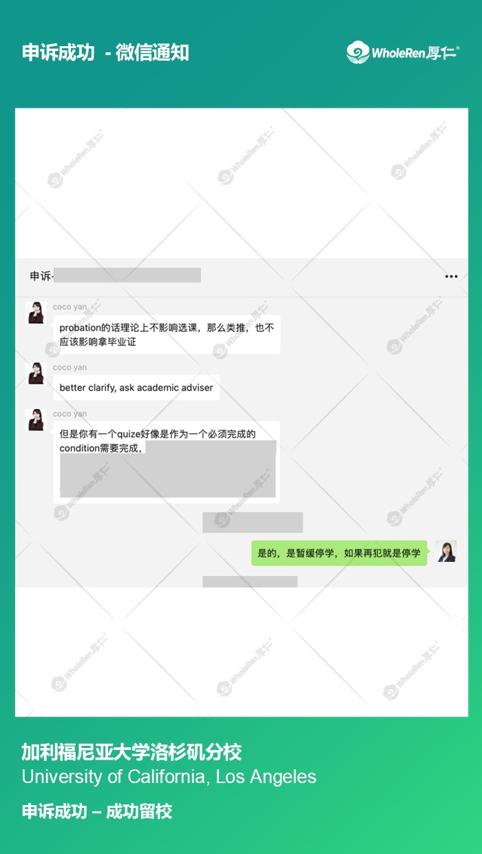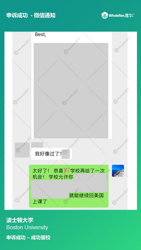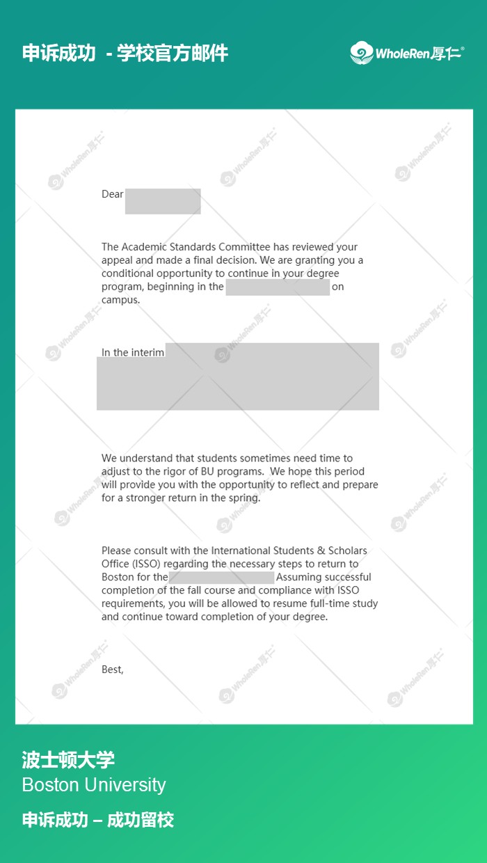 X同学因为家庭原因导致心理抑郁,没有心思读书,结果期末时两门课F,严重影响了GPA,被学校开除。专家老师在了解学生的情况后,指导学生准备申诉信,诚恳解释自己成绩不理想的原因,证明自己有能力继续完成学业,最终学校通过了X同学的申诉,成功留校。