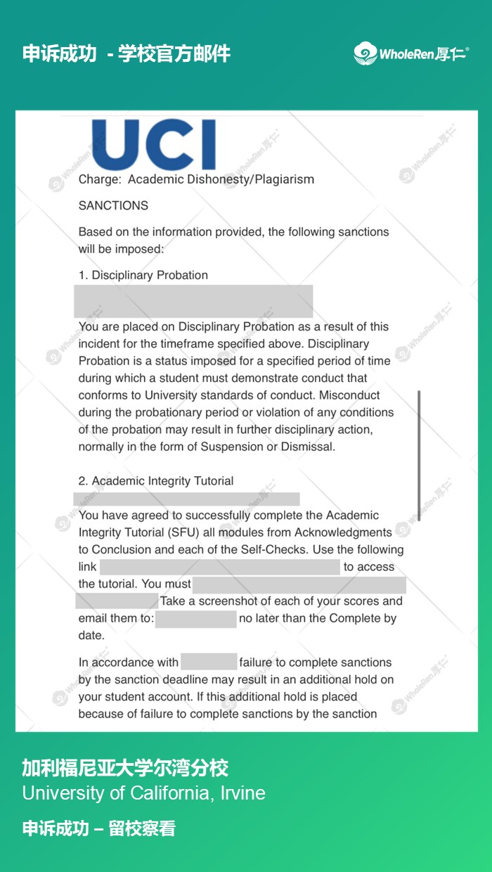 E同学在一次考试的时候想核对答案便打开了课件,被老师在后台查到,于是上报了学校,要召开学术诚信听证会。通常哥大的研究生第一次出现学术不诚信的行为时会受到停学的处分,所以学生很可能无法顺利毕业。专家老师了解学生的情况后,指导学生积极准备听证会的材料,证明自己无作弊动机,最终成功说服了学校,只给了probation的警告处理。