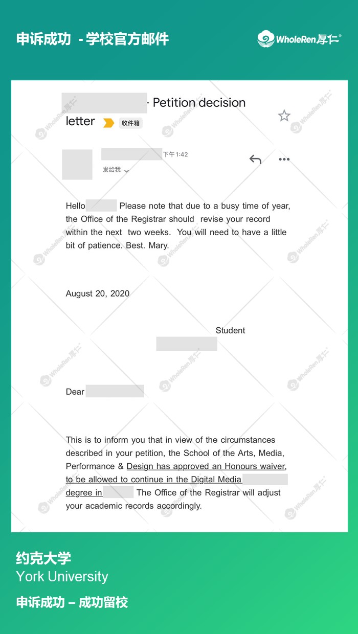 分析学校对递交申诉信的要求,根据学生自身情况以及与学校沟通细节,找出申诉有利的点,仔细斟酌,不断完善,让申诉内容有理有据,成功说服老师