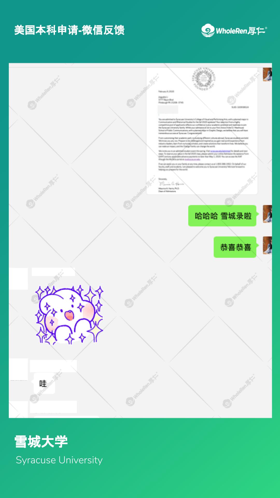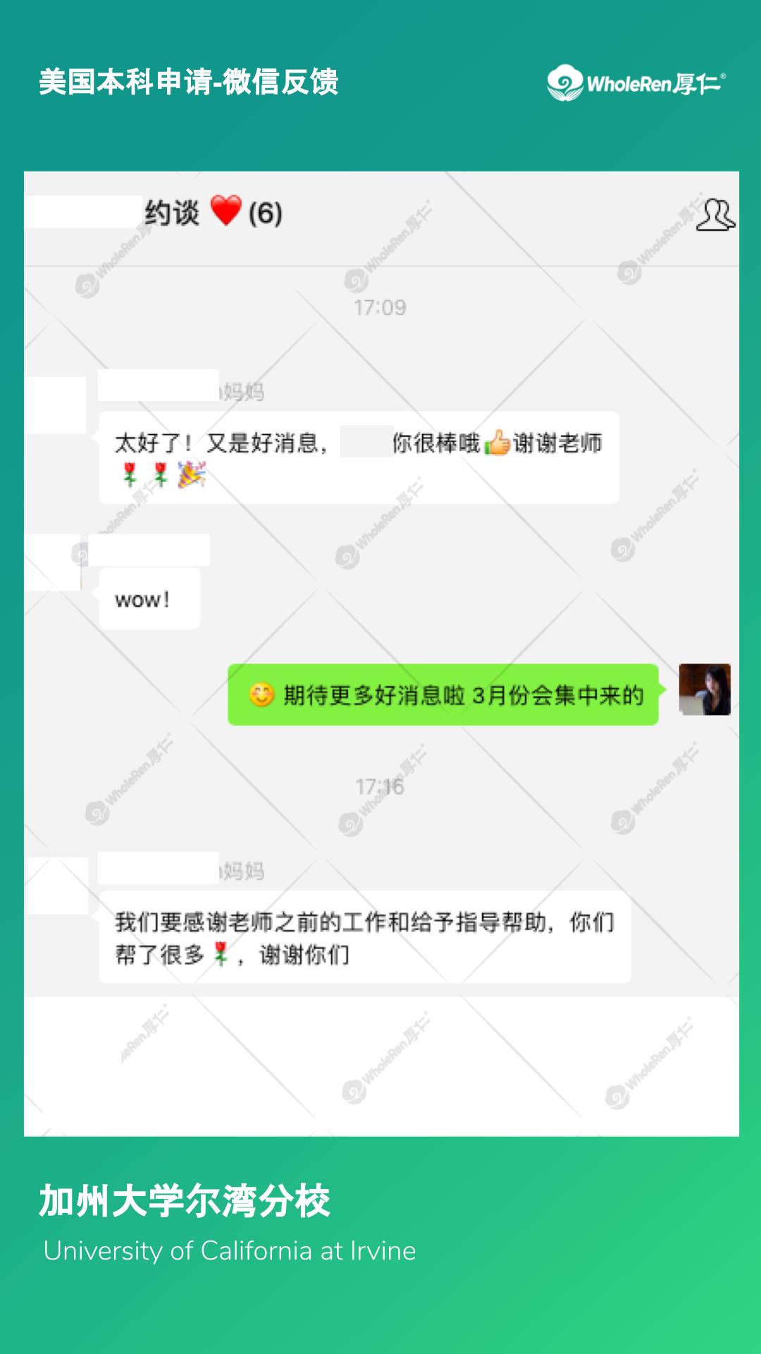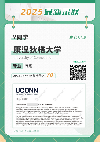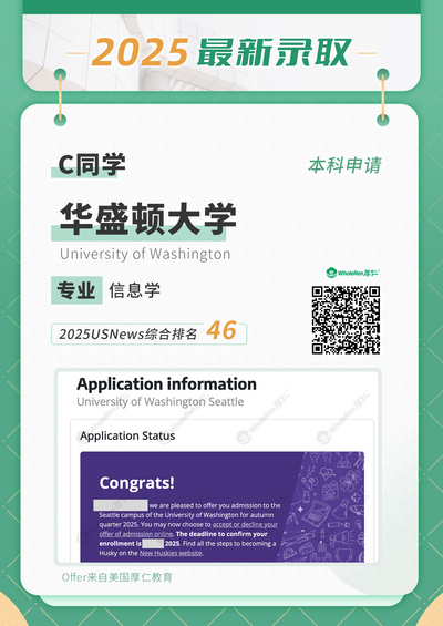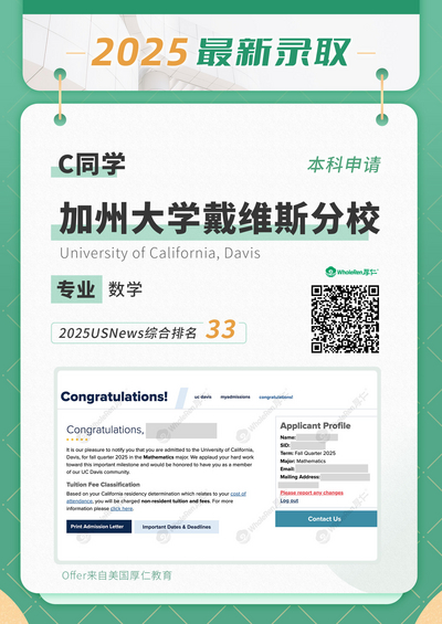 录取结果:加州大学圣地亚哥分校、加州大学尔湾分校、伊利诺伊香槟分校、加州大学圣塔芭芭拉分校