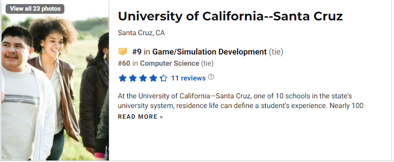 学校的娱乐艺术与工程 (EAE) 项目是视频游戏教育和研究领域的一流项目,是美国新兴游戏学科的领先者。EAE定义了一个新的跨学科信息学领域,将艺术、人文、社会科学和计算机研究与实践深度融合。