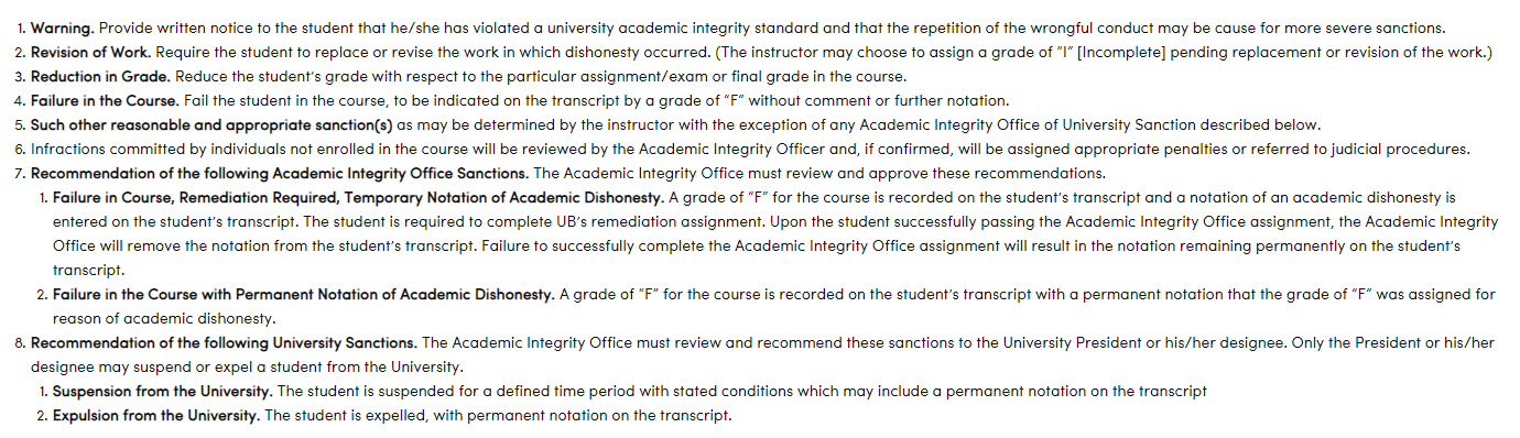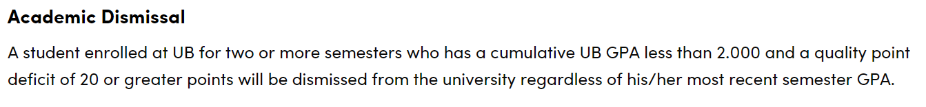 如果学生的UB累积GPA为2.0或更高且学生最近的UB学期GPA为2.0或更高,则学生为Good Standing。Good Standing的学生有资格参加学校所有活动。当学生的学期GPA低于2.0,即使累积GPA高于2.0,学生将会被学术警告(Academic Warning)。虽然学术警告的学生在参加大学活动时会被认为有良好的学习状态,但可能会被要求与学术顾问进行讨论,以帮助建立有效的学术计划。