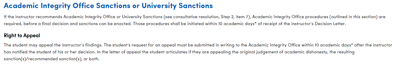 在收到处分通知后, UB 学生可以对教师的调查结果提出上诉(Appeal)。 学生必须在收到决定后的10个工作日内以书面形式提交给学术诚信办公室。