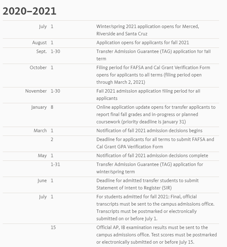 以下是加州大学的申请时间节点。想要申请加州大学的同学,课外活动、文书等等材料一定要尽早准备起来!